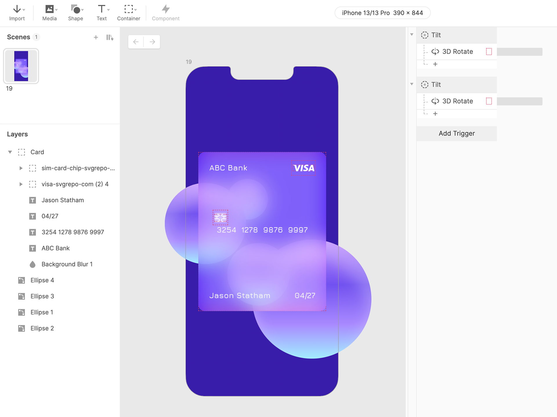 This is a project I made in Protopie. The card tilts depending on how the user rotates their phone. I thought it was a fun effect to share. Check out the video below!